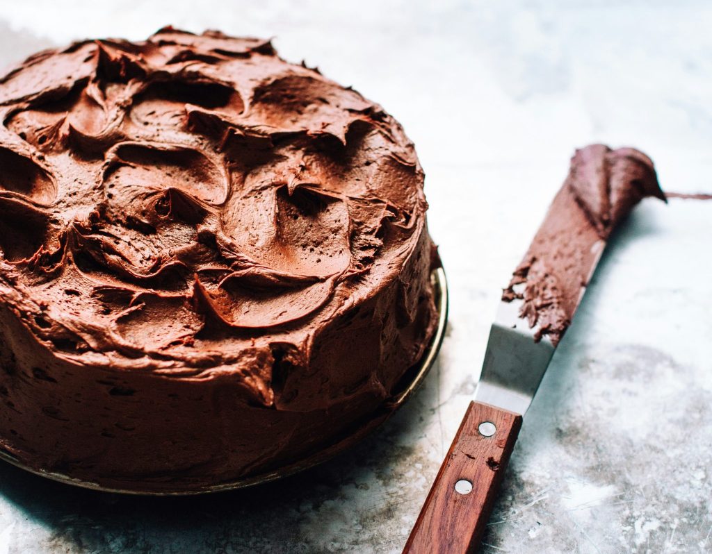 For the chocolate icing, whip 250g butter, then stir in 400g icing sugar, 15ml cocoa powder and 50ml cream until smooth and spreadable. Spread over the cooled cake.