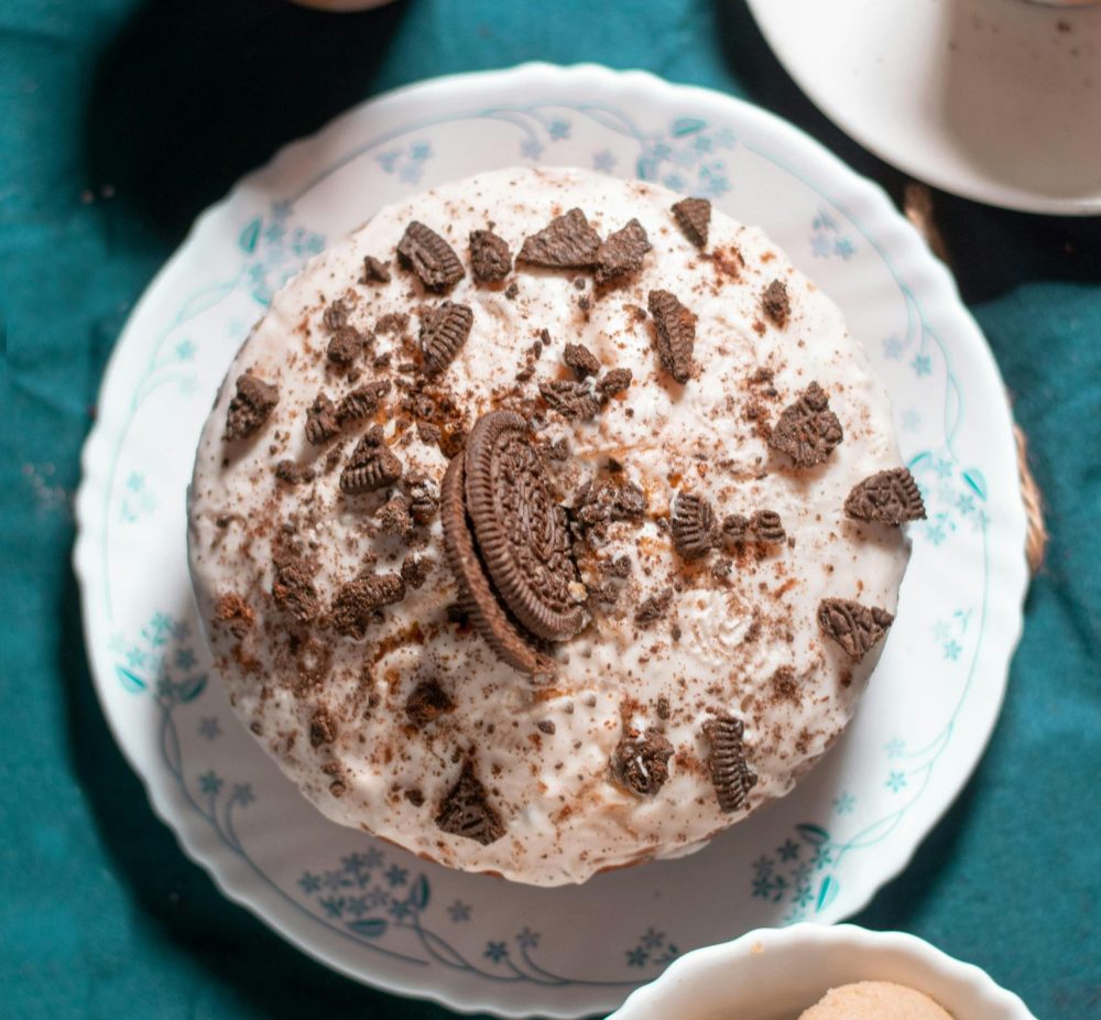 For the icing, melt 150g white chocolate and spread over the top. Finish with 20g–25g crushed Oreos or Tennis biscuits for a nostalgic touch.